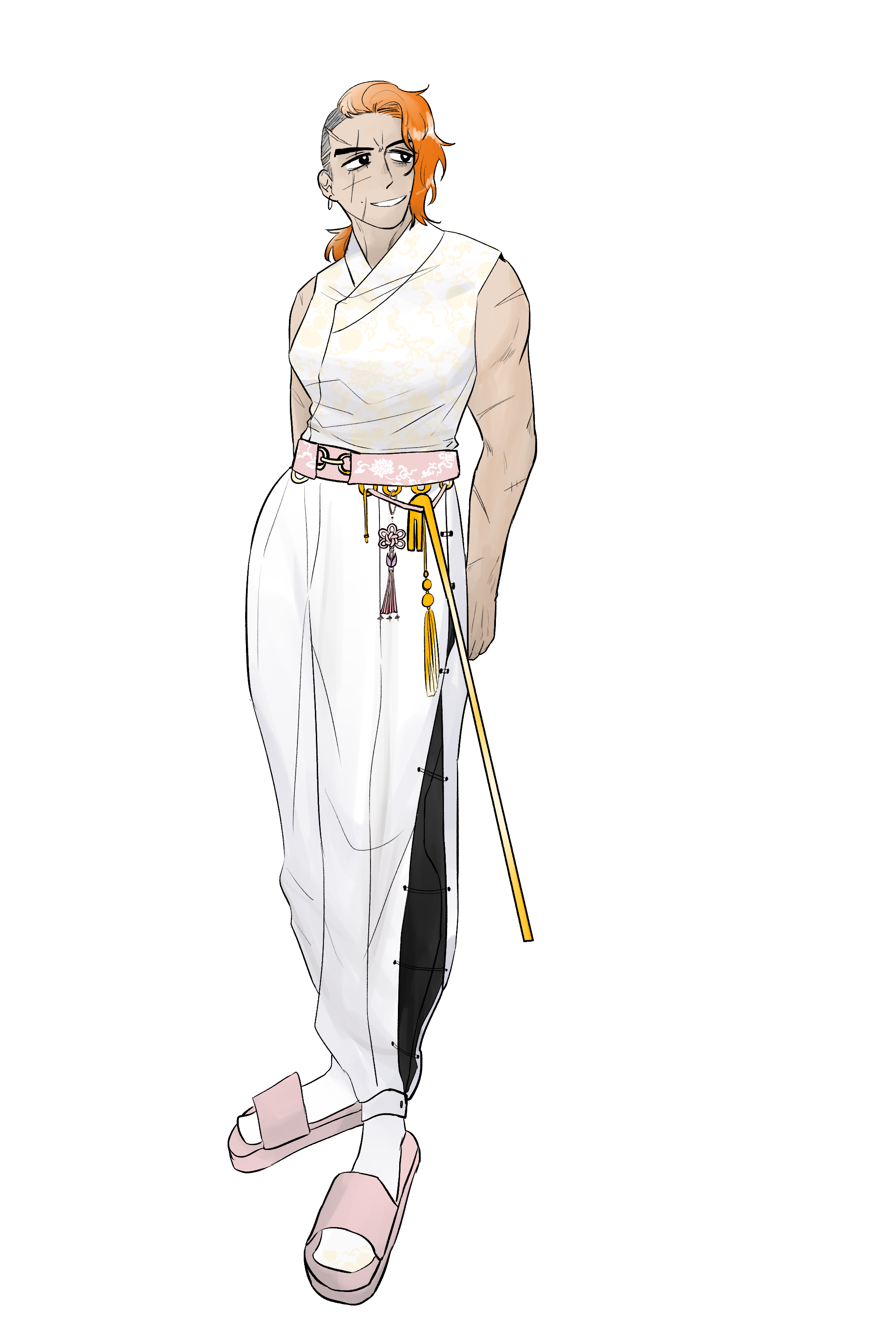 상의와 하의가 연결된 점프 슈트를 입고 있다. 바지는 양 옆으로 트임이 있는데, 오른쪽의 트임은 저고리와 연결되어 허리띠만 풀면 간편하게 옷을 갈아입을 수 있는 형식이다. 허리띠에 달려있는 고리에 주머니나 무기, 노리개나 장식 등을 이것저것 달고 다닌다. 보온을 위해 검은 안감이 들어있는 옷이며, 바지 안에도 타이즈를 신었다. 발에는 버선에 분홍 슬리퍼. 뭐 좋은 데 가는 것도 아니고, 아무거나 신으면 된다고 직직 끌고 다닌다.